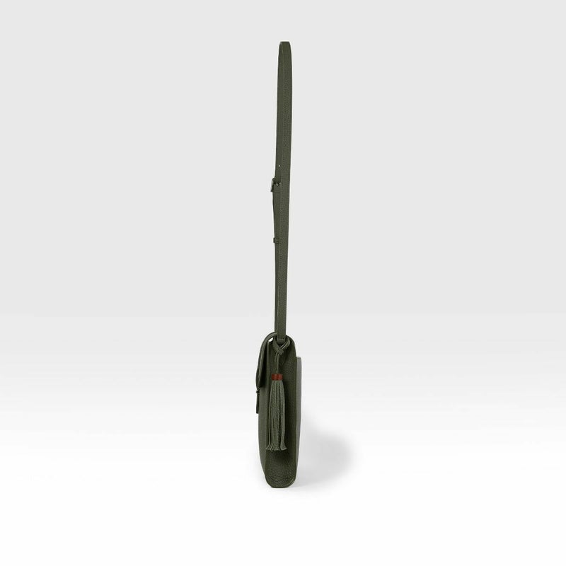 ストラップ付きのフラップは差し込むだけで開閉ができ、ショルダーの長さも調整できるので、体形や使用シーンに合わせて使えます。