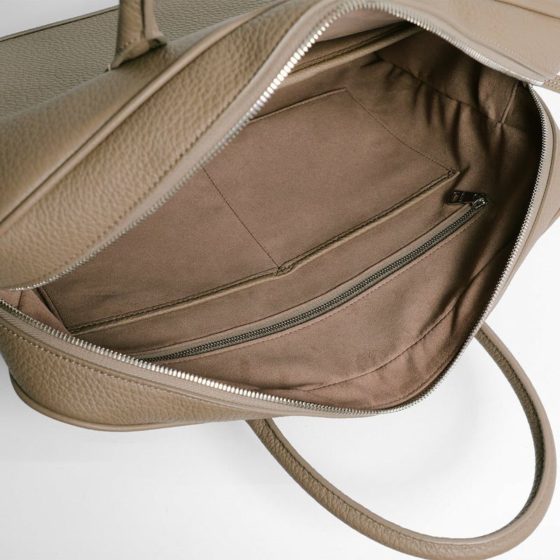 地面に置いたときにも自立しやすく、内装にはPCポケット、ファスナーポケット、オープンポケットを2つ採用と、小物の収納に便利な作りとなっています。
