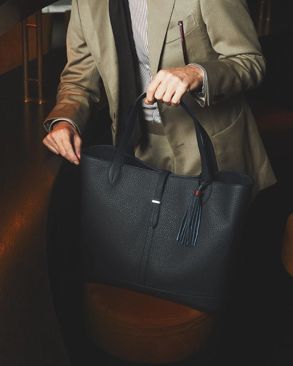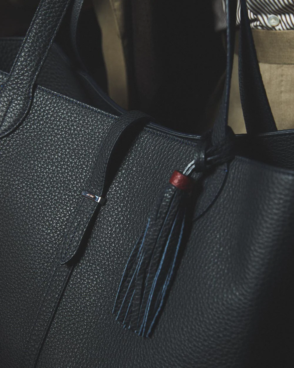 開口部にストラップを取り付け、ブランドアイコンのひとつである取り外し可能なタッセルを付属。