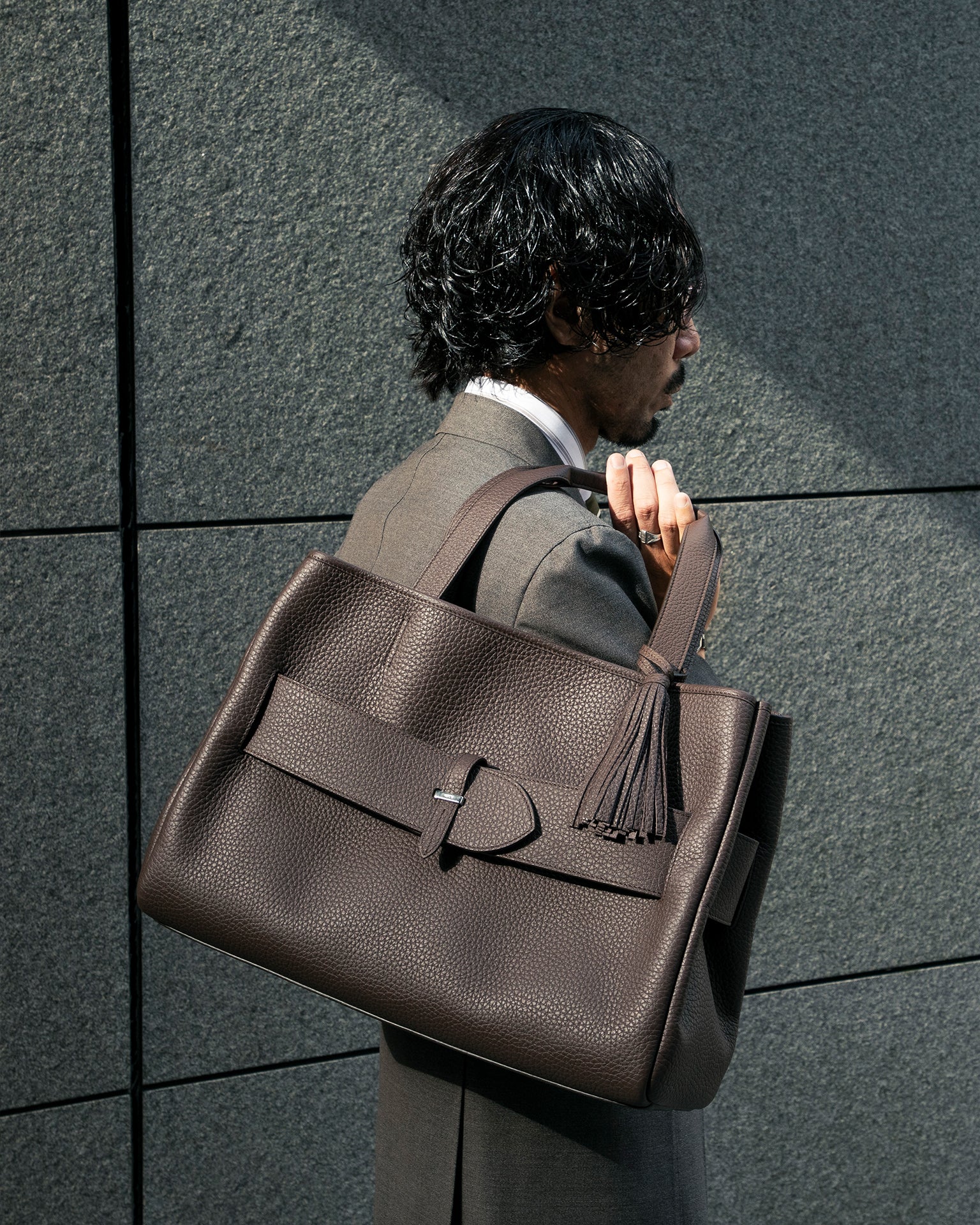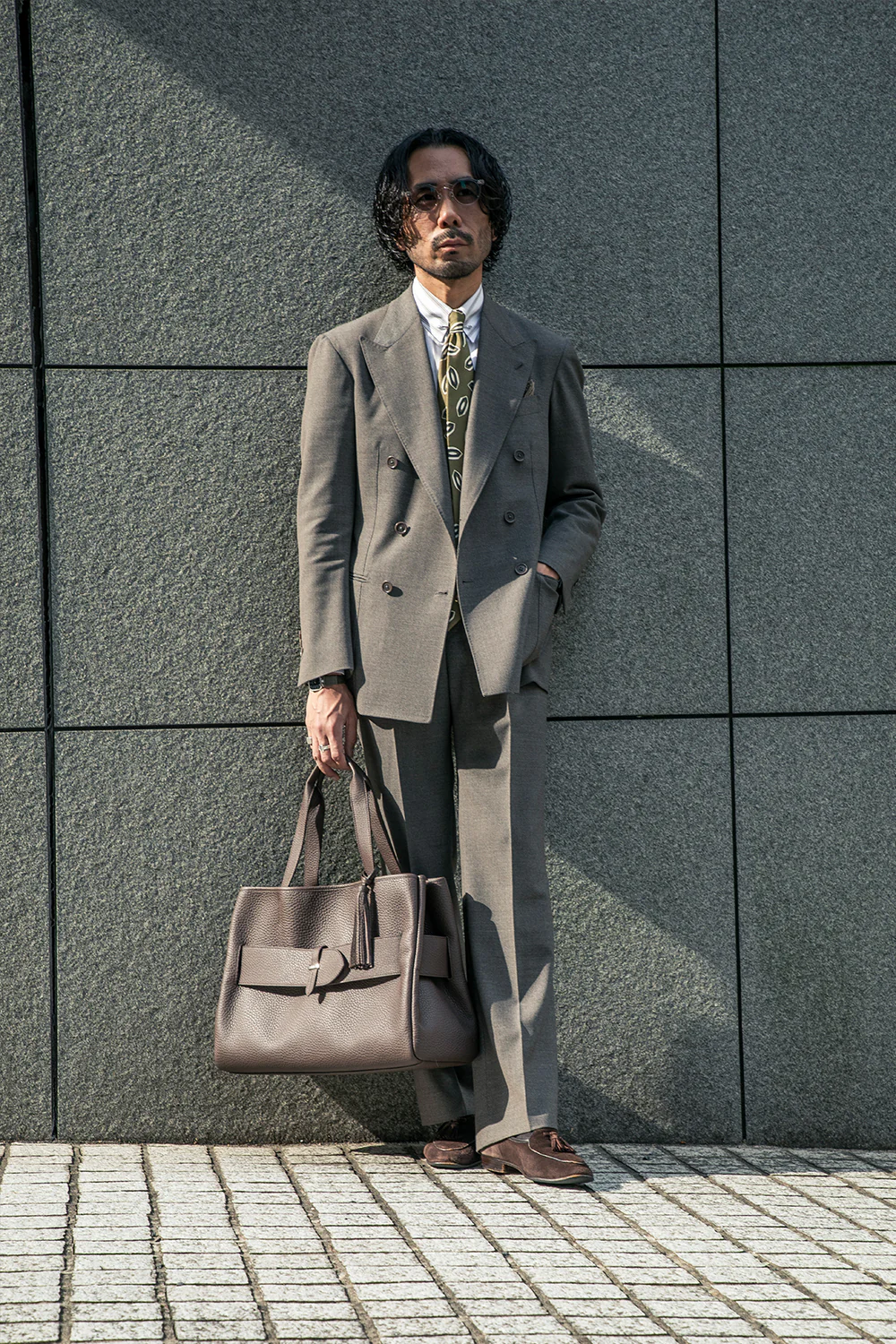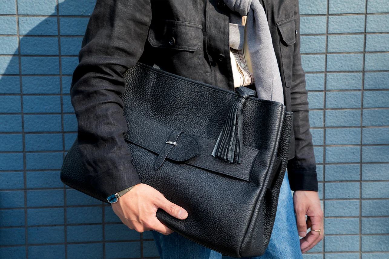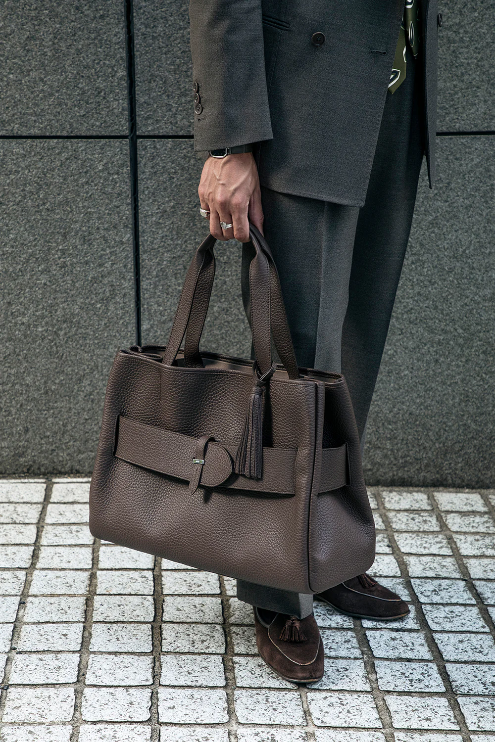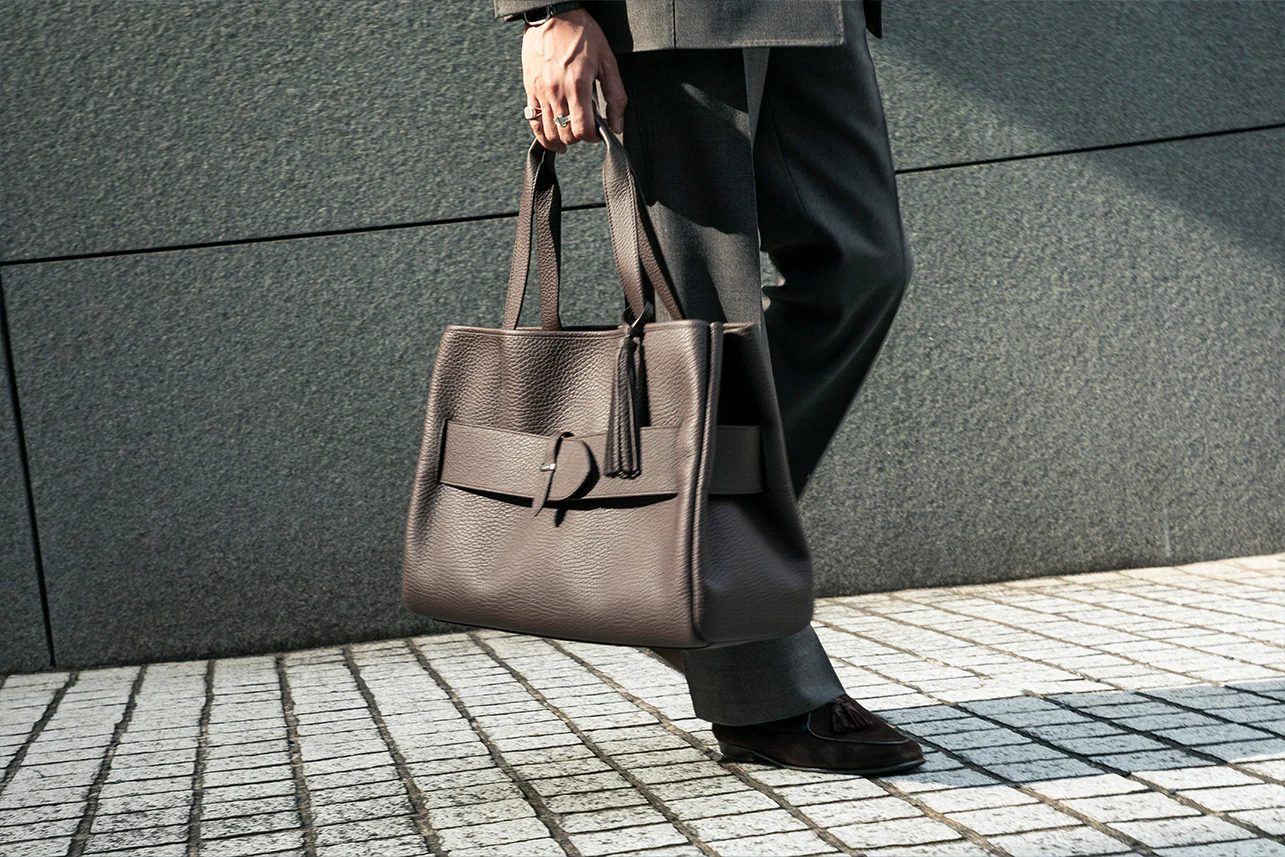 スーツスタイルに敢えてダークブラウンのトートバッグを持つことで洒脱な雰囲気に。