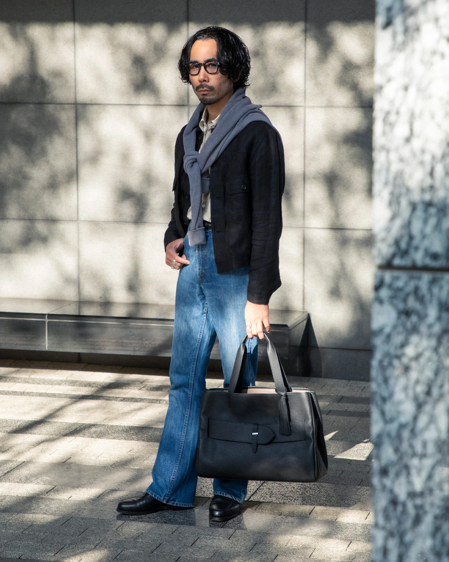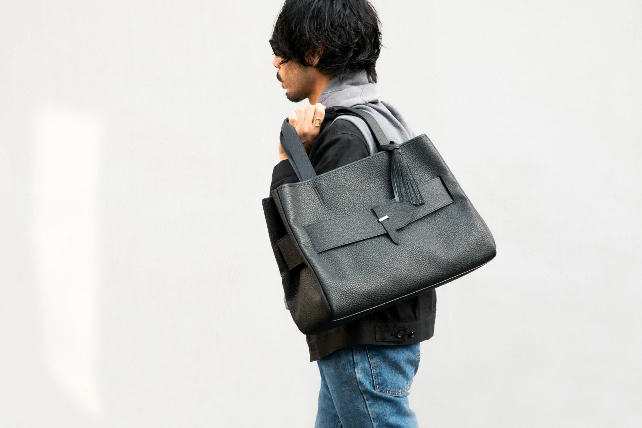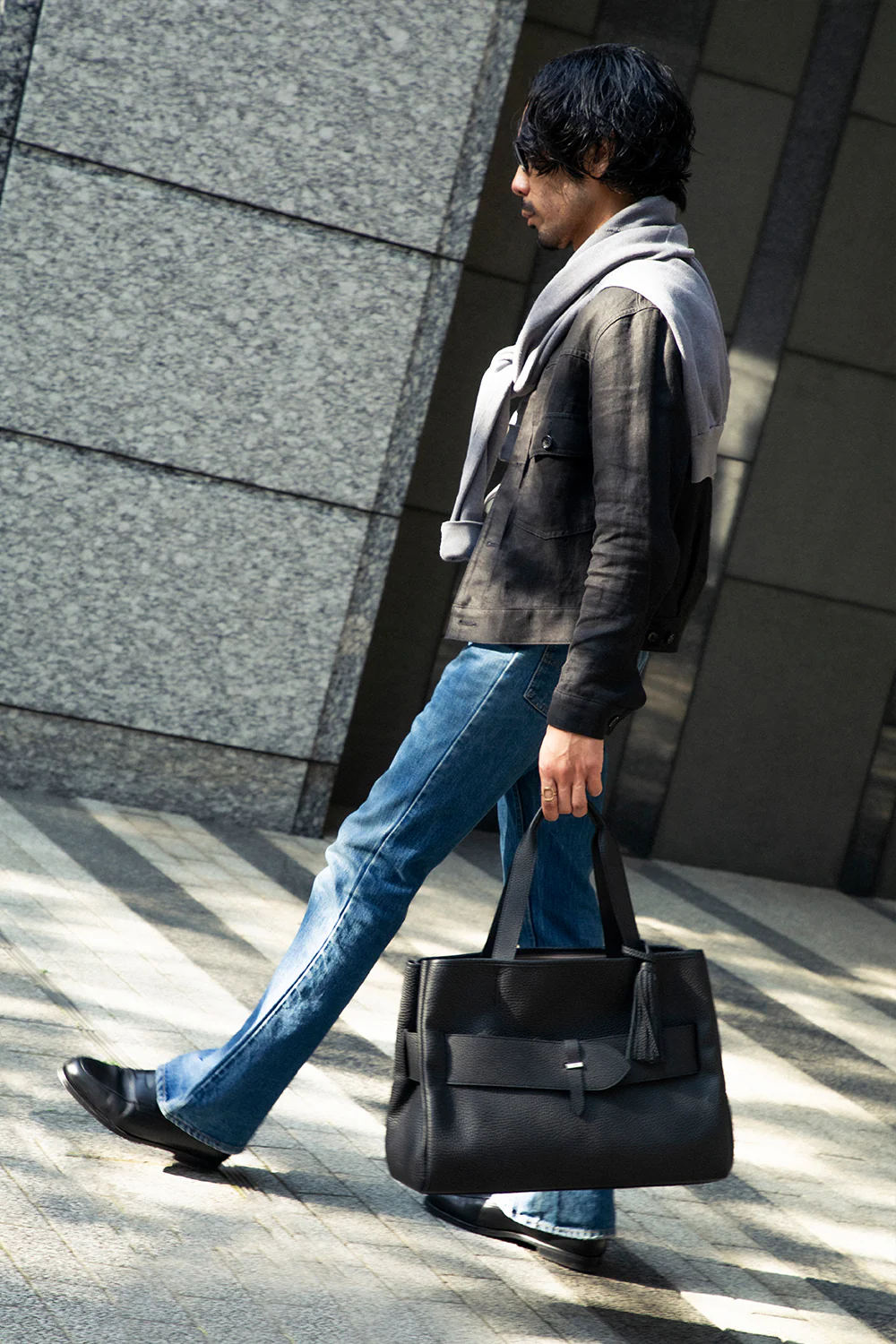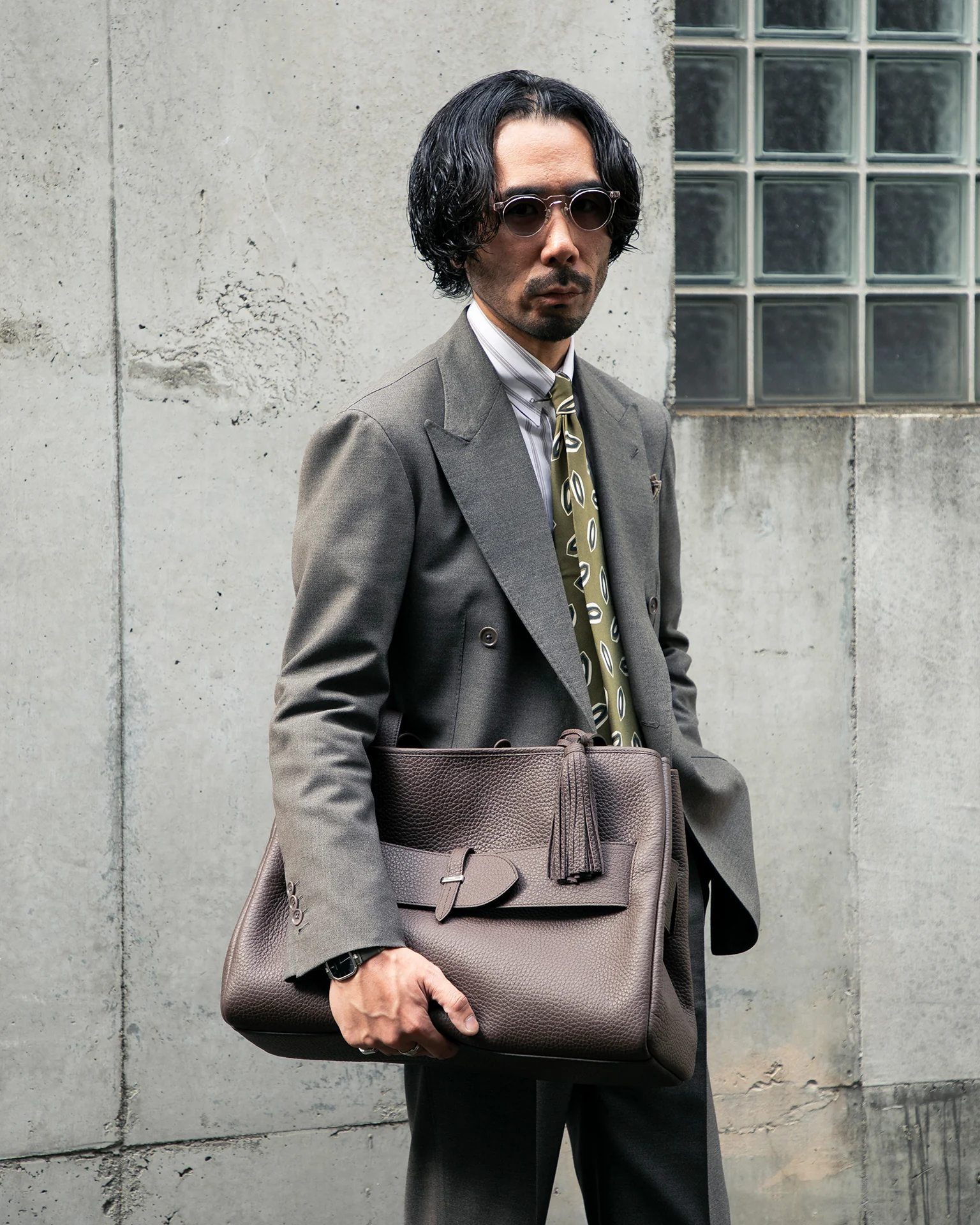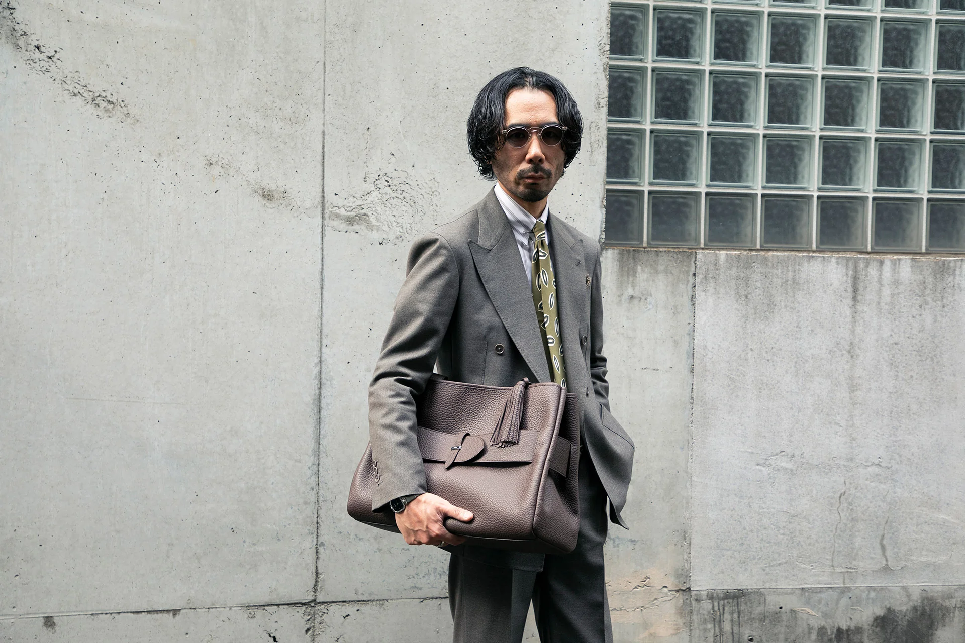 スーツスタイルに敢えてダークブラウンのトートバッグを持つことで洒脱な雰囲気に。