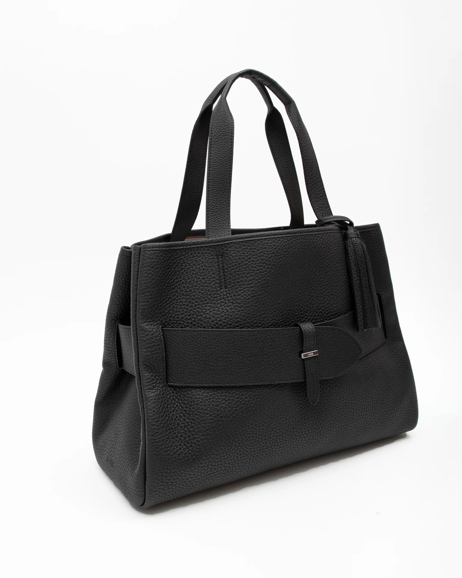 ACATEのブランドロゴが刻印されたメタルパーツと特徴的なベルトデザインが掛け合わせることでモダンな印象に。
